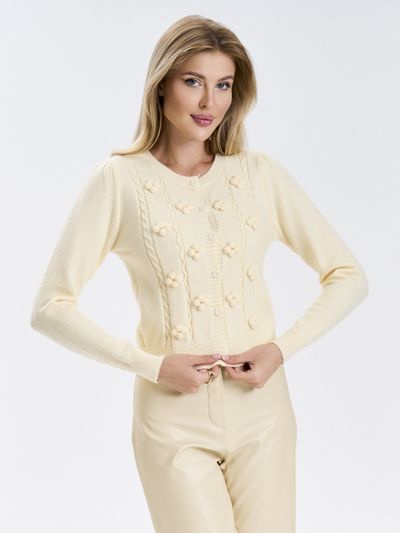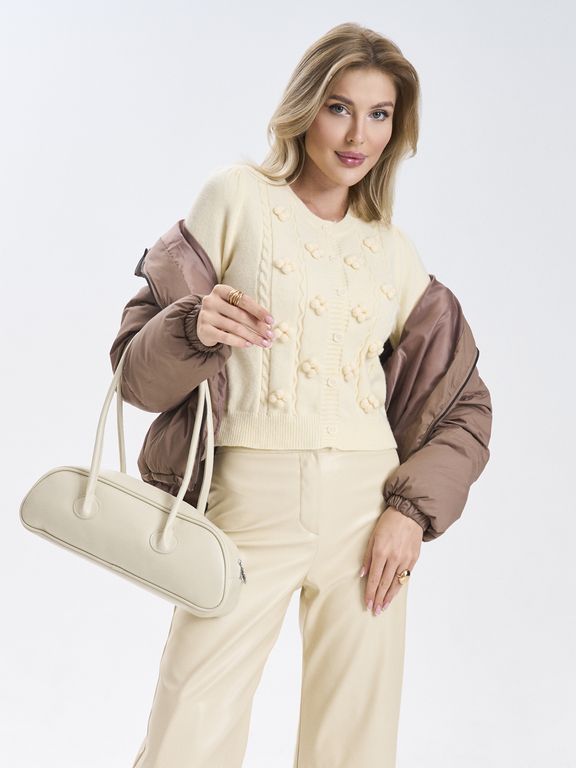 Представляем укороченный кардиган молочного цвета - идеальное сочетание стиля и комфорта. Изготовленный из мягкой и приятной на ощупь пряжи, он обеспечит комфорт и тепло в прохладные дни. С легкостью сочетается с любыми нарядами, от джинсов и футболок до платьев и юбок. Сливочный цвет кардигана придает образу свежесть и легкость, делая его подходящим как для повседневной носки, так и для более торжественных случаев. Укороченный фасон подчеркивает талию и создает модный образ